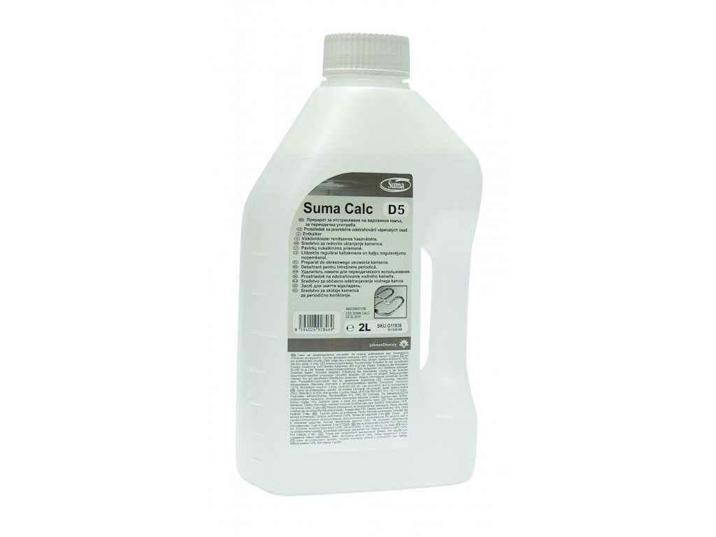 Suma Calc D5 prostředek na pravidelné odstraňování vápenatých úsad Kapalný koncentrovaný kyselý čisticí prostředek určený pro odstraňování úsad z kuchyňského náčiní a zařízení, boilerů, ohřívacích lázní, kávovarů, myček nádobí apod. Jen pro profesionální použití. Návod k použití: Odstraňování úsad namáčením: ponořte náčiní do lázně (50 – 200 ml/1 l horké vody), dle potřeby mechanicky odstraňte úporné zbytky a důkladně opláchněte čistou vodou. Čištění postřikem: nastříkejte roztok (200 ml/1 l teplé vody) na povrch, nechte působit max. 30 min. a vydrhněte. Důkladně opláchněte teplou vodou. Odkamenovávání myčky: vypněte dávkování mycího a oplachovacího prostředku. Naplňte myčku čistou vodou a přidejte prostředek (50 – 100 ml/1 l vody), nechte roztok cirkulovat 5 – 15 min., vypusťte myčku a důkladně vypláchněte myčku vodou, nechte vodu cirkulovat min. 5 minut.Doplňkové parametry